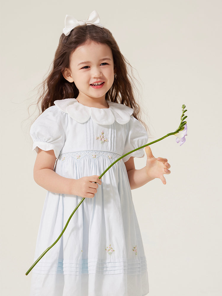 - The pure ice blue color is paired with a white doll collar and petal sleeves.