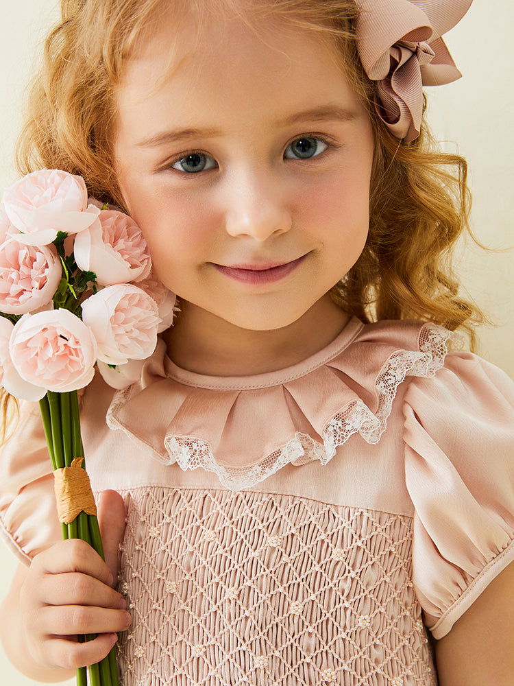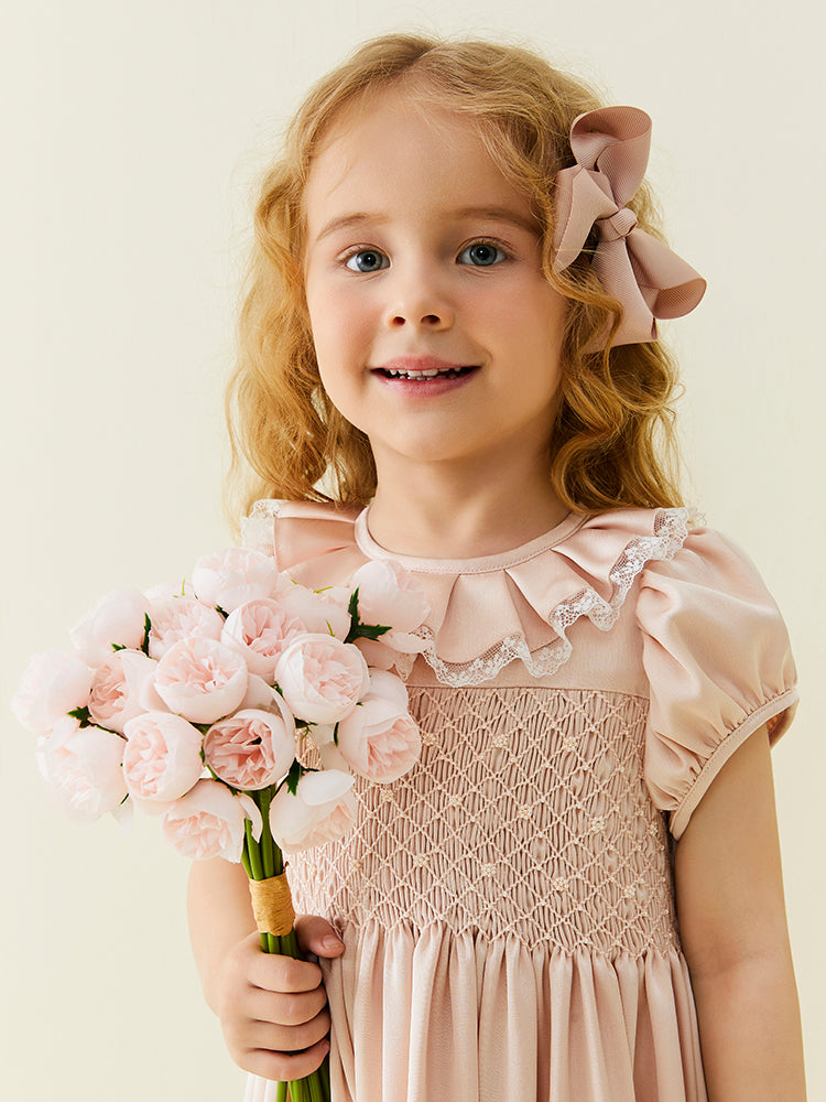 - Handmade smocking with bright matching-colored beads, not only enhances the aesthetics of the garment but also showcases exquisite craftsmanship.
