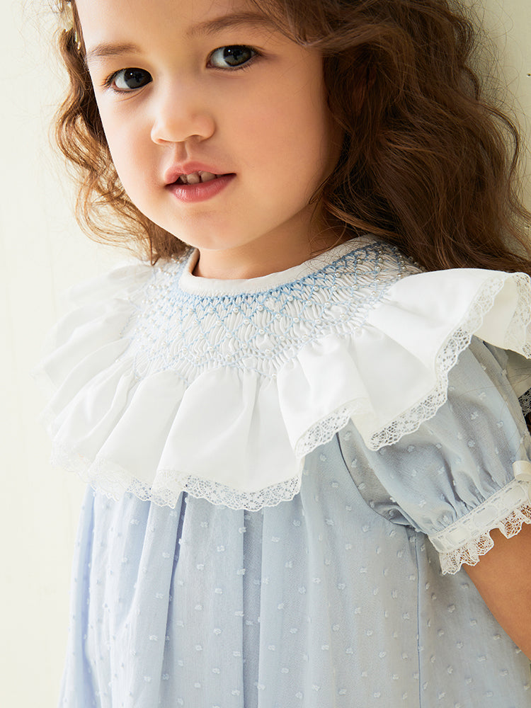- A variety of embroidery techniques are used, employing gradient threads to embellish the Bishop collar with exquisite hand-pleated embroidery.