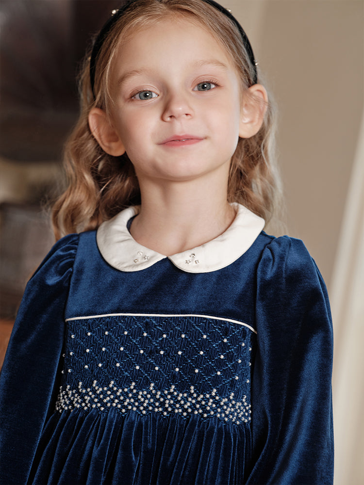 - Handmade smocking paired with small pearl studs, features exquisite details that highlight the craftsmanship of the garment.