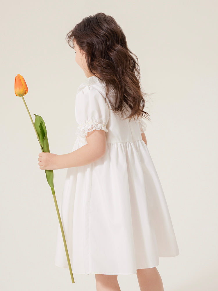 The puff sleeve design with lace on the cuffs not only adds dimension to the garment, but also makes it more cute for children when wearing it.